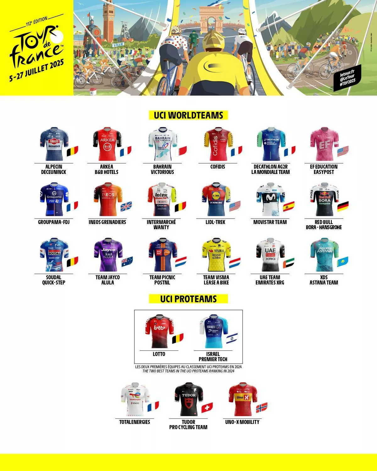 The teams that will be on the starting line in Lille on July 5 have been announced by the Tour de France.
